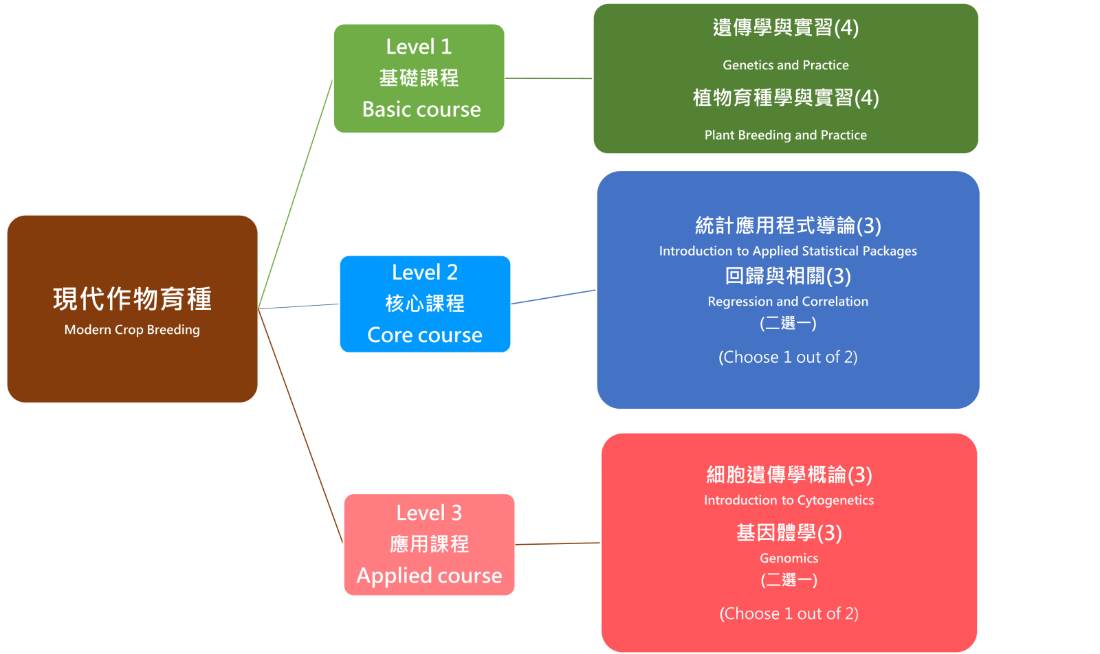| 修課指引 | 現代作物育種在 Level 2以及Level 3 皆有多選設計,學生需從這兩大類中分別擇一修讀。其修課指引強調學習內容之不同,有助學生釐清課程之間的差異