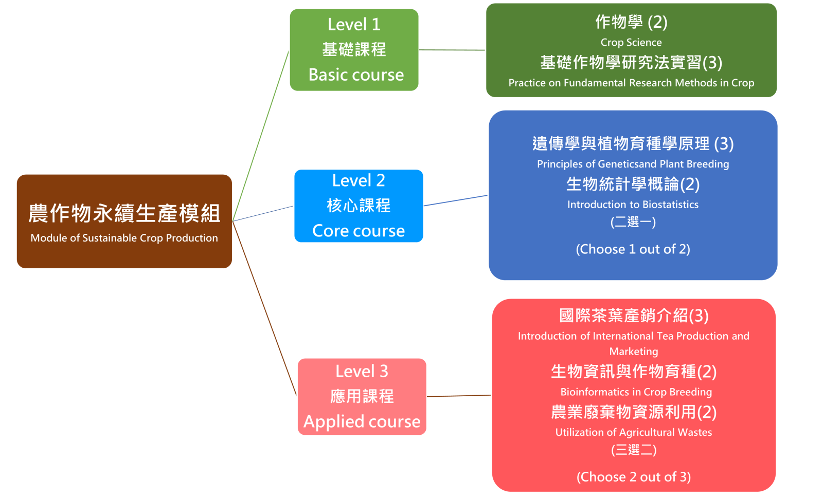 | 修課指引 | 農作物永續生產模組在Level 2核心課程(二選一)與Level 3應用課程(三選二)有多選設計,學生需分別從這兩大類中選課修讀。