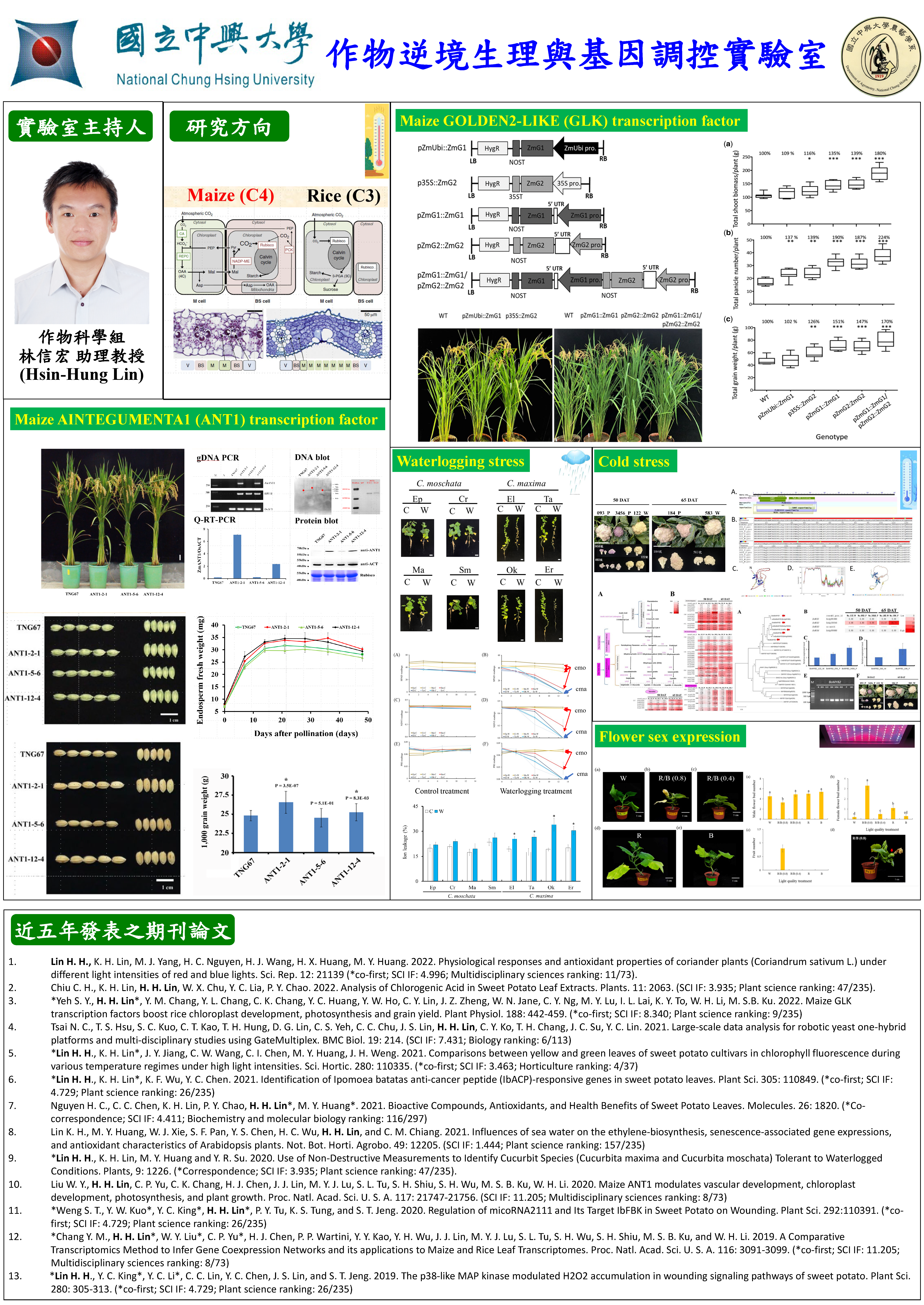 - Lin KH, SP Chen, YR Su, YH Tsai, H. H. Lin*. 2024. Waterlogging influences the physiology index and antioxidant enzyme activity in Cucurbita maxima and Cucurbita moschata. Horticulture Environment and Biotechnology. 65(1): (*Correspondence; SCI IF: 2.4; Horticulture ranking: 9/36).