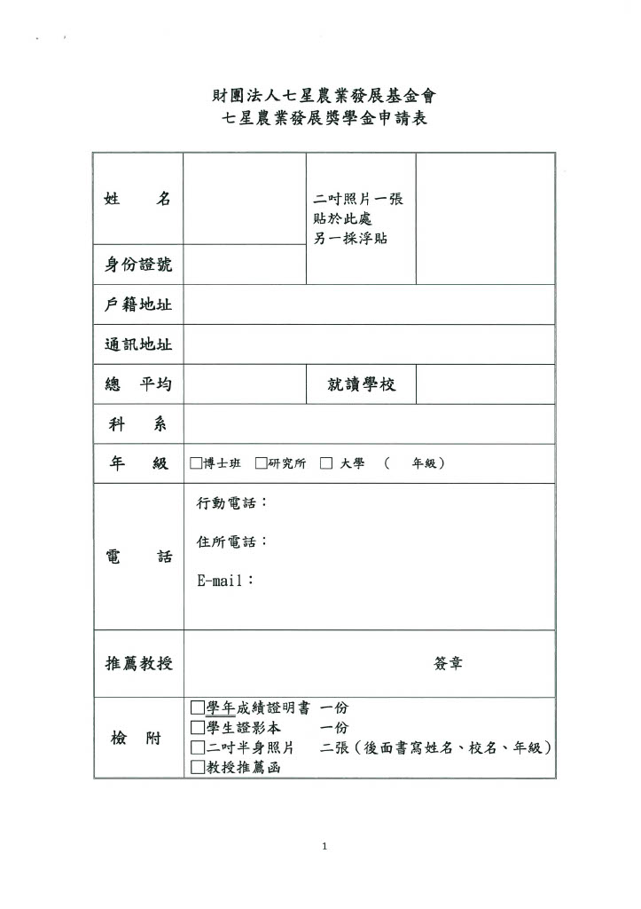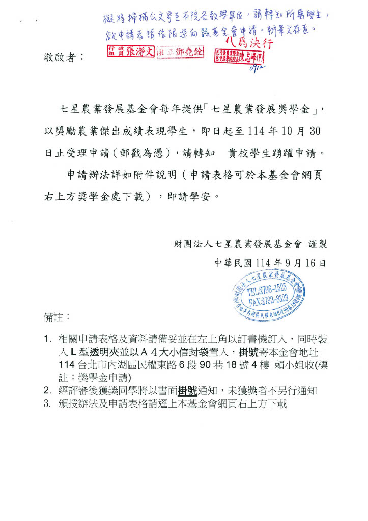 財團法人七星農業發展基金會「七星農業發展獎學金」,請同學踴躍申請