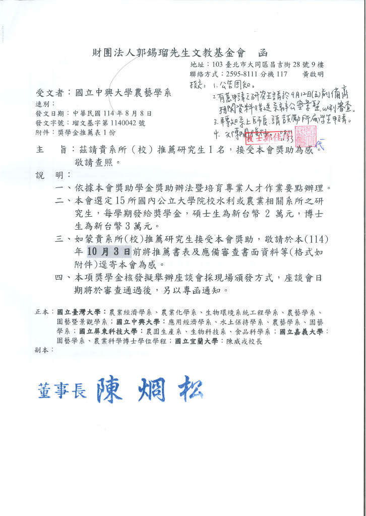 本校114學年度教育部博士生獎學金,農資院即日起受理申請,至9月5日截止