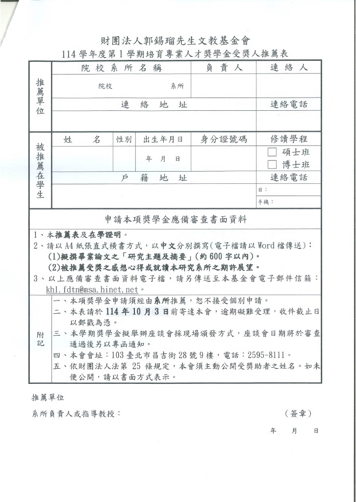 114學年度第1學期 郭錫瑠基金會獎學金申請....