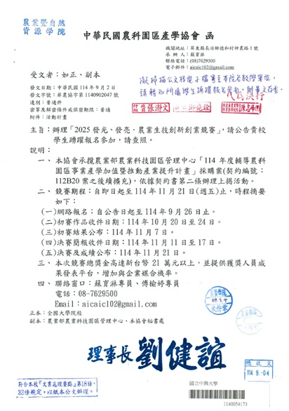 歡迎同學踴躍申請2025發光、發亮.農業生技創新創業競賽