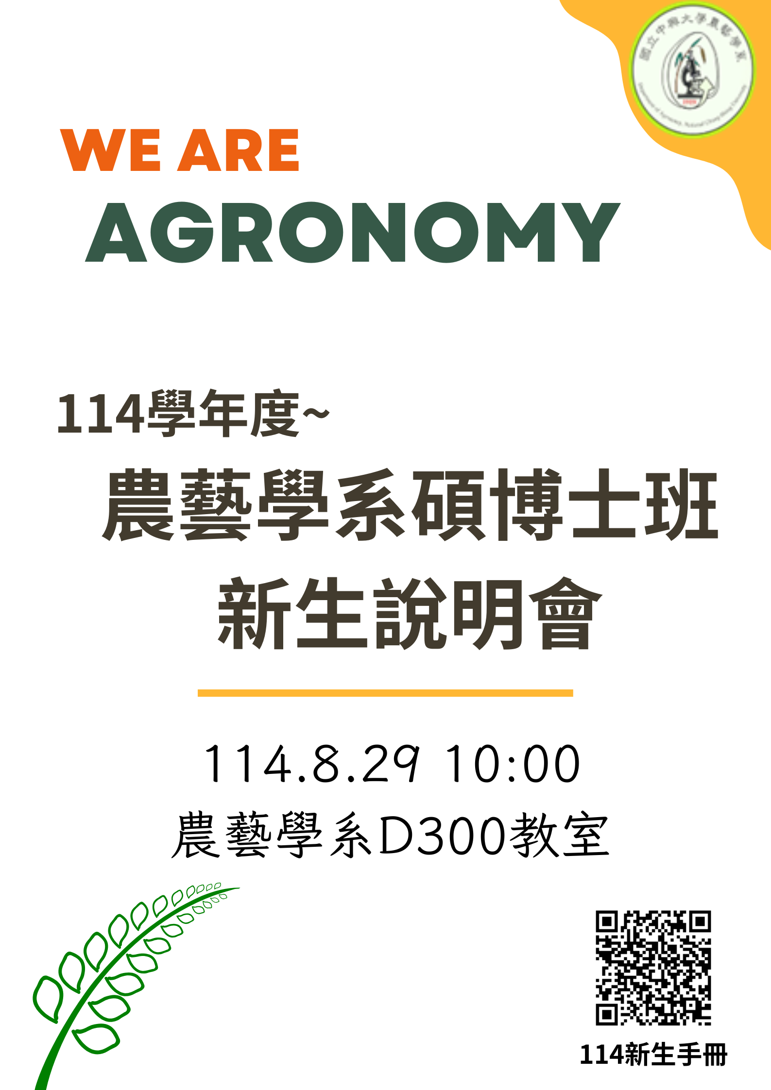114學年度 本系碩博士班新生座談會於年8月29日(五)上午10時 D300教室舉行,請各位師長及同學踴躍出席~