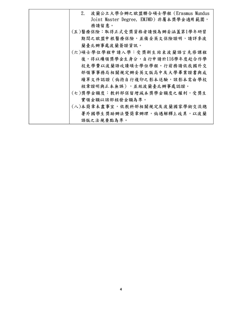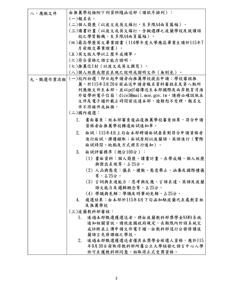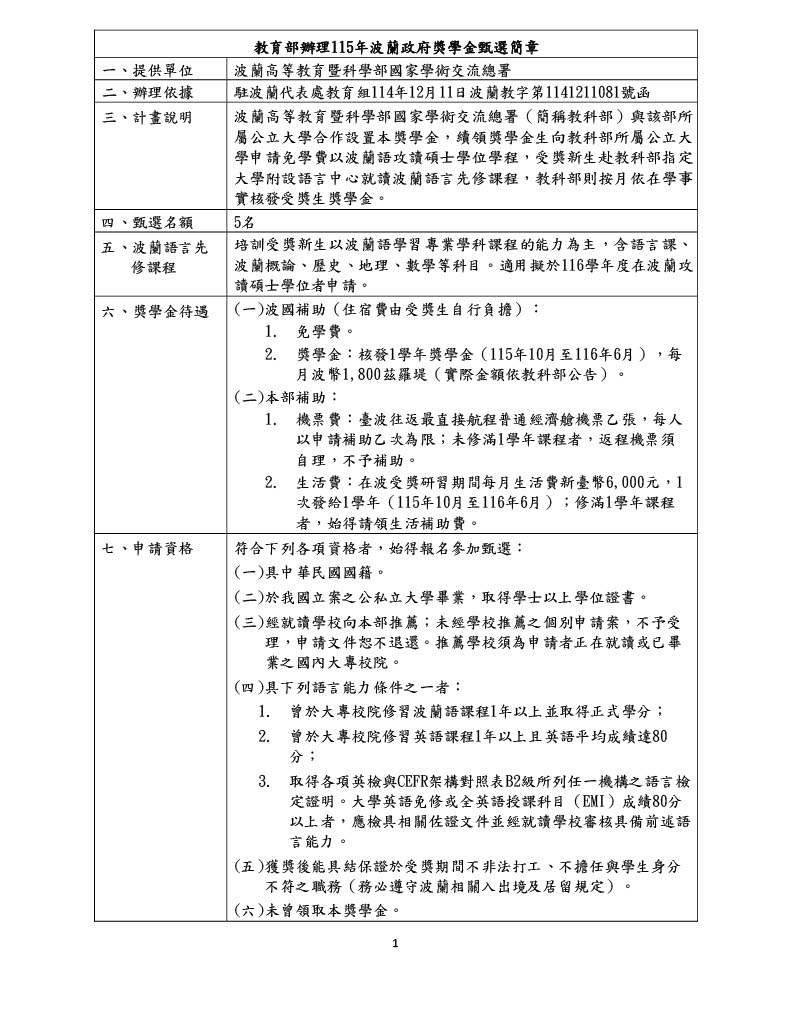 歡迎同學踴躍申請115學年赴波蘭高等教育機構短期進修/研究獎學金