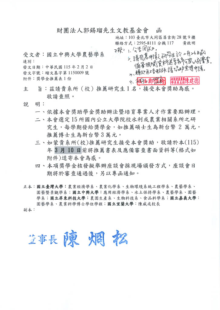 歡迎同學踴躍申請114-2郭錫瑠先生獎學金申請....