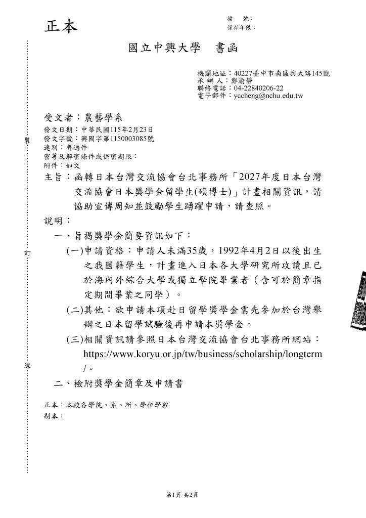 歡迎學生踴躍申請2027年度日本台灣 交流協會日本獎學金留學生(碩博士)