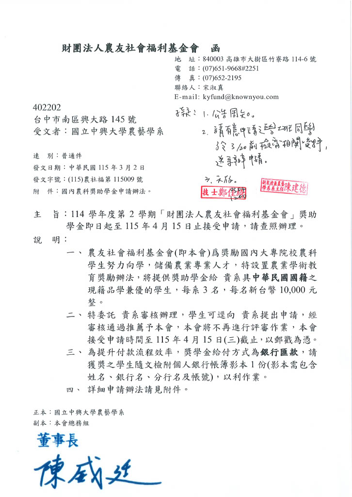 歡迎同學踴躍申請114-2「財團法人農友社會福利基金會」獎學金申請至115年4....