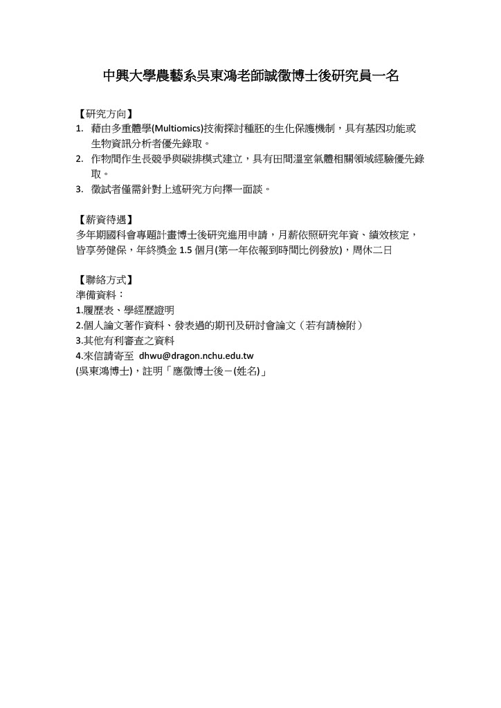 中興大學農藝系吳東鴻老師誠徵博士後研究員一名.pdf