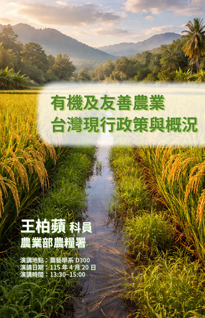 歡迎踴躍參加4/20的演講:邀請王柏蘋科員( 農業部農糧署) 主題(有機及友善農業 台灣現行政策與概況)